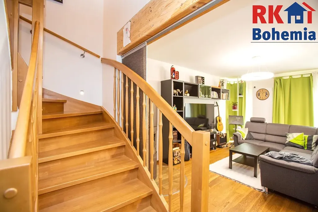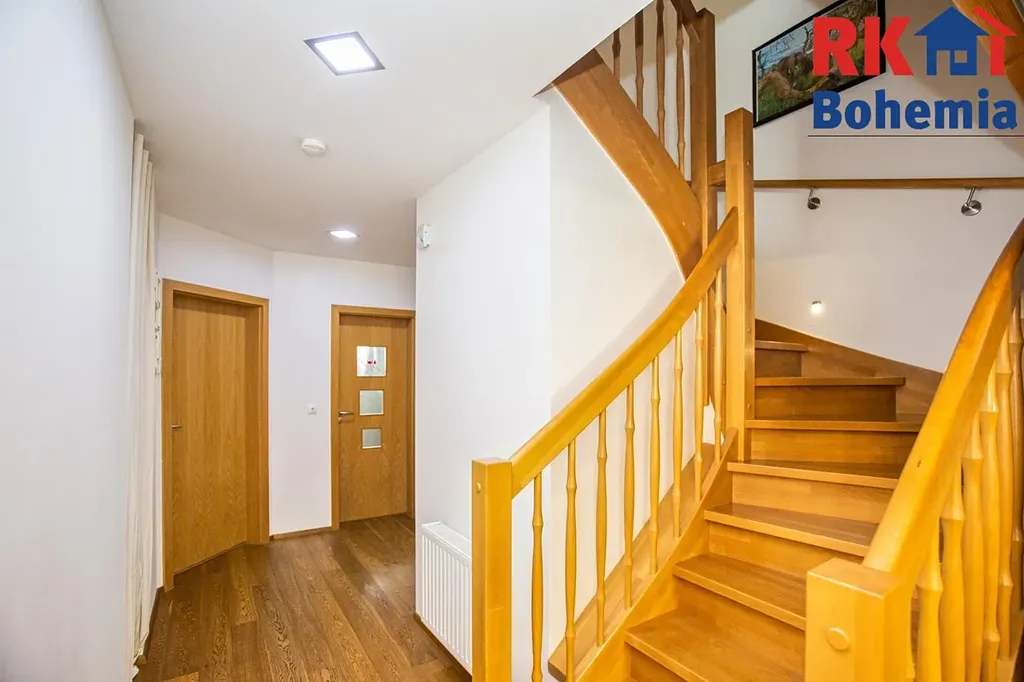 Vysoký standard bydlení definují prvotřídní materiály - interiéru dominují masivní dubové podlahy, dřevěné schodiště a elegantní dýhované dveře včetně zárubní. Hřejivou atmosféru domova dokreslují krbová kamna v hlavním obývacím prostoru.