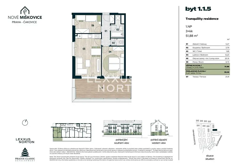 Nabízíme k prodeji světlý byt o dispozici 3+kk v novém rezidenčním projektu Nové Miškovice. Byt disponuje užitnou plochou 51,88 m² a výrazným benefitem v podobě prostorné terasy o velikosti 21,41 m², která přirozeně rozšiřuje obytný prostor a nabízí příjemné místo pro každodenní odpočinek.