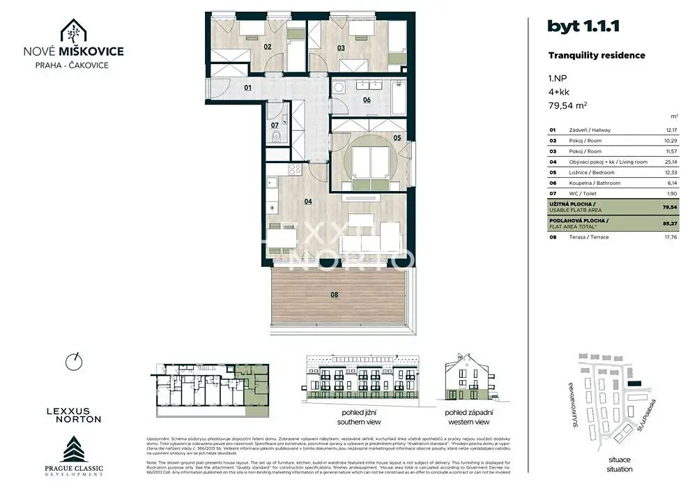 Nabízíme k prodeji promyšleně řešený byt 4+kk v rezidenčním projektu Nové Miškovice v Praze – Čakovicích. Byt disponuje užitnou plochou 79,54 m² a příjemnou terasou o velikosti 17,76 m², která přirozeně rozšiřuje obytný prostor a přináší možnost každodenního kontaktu s venkovním prostředím.