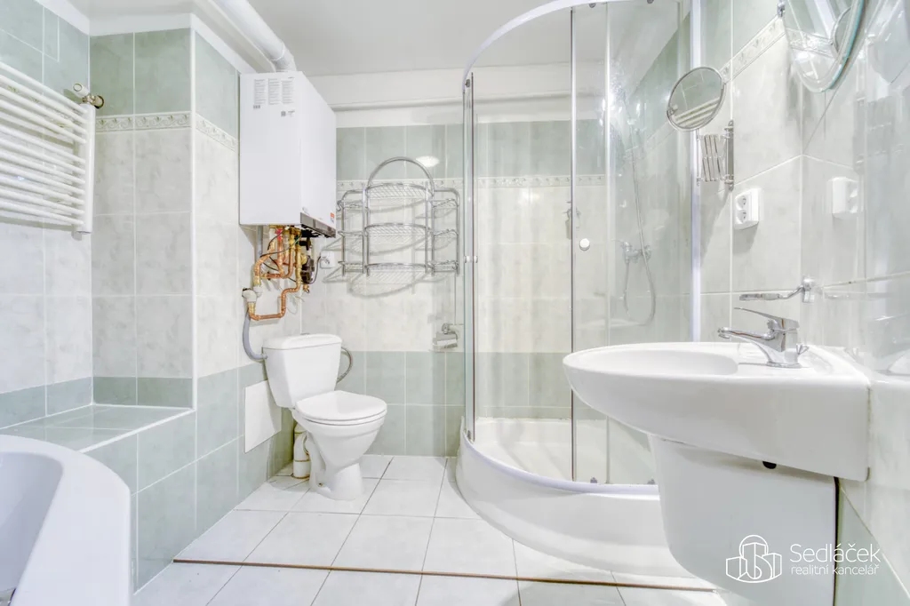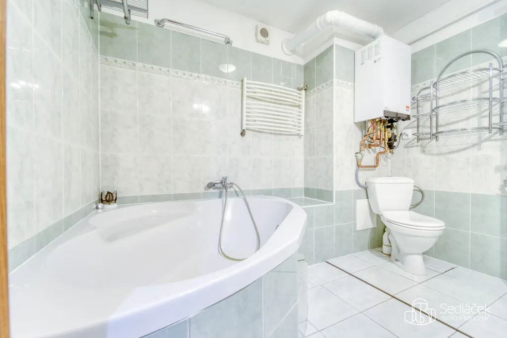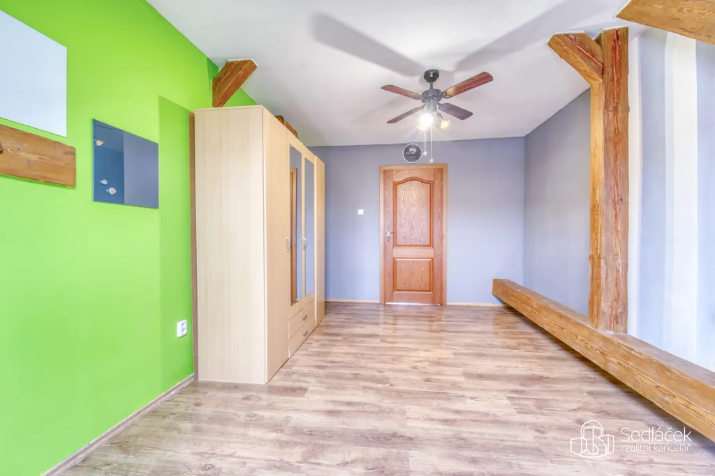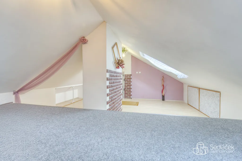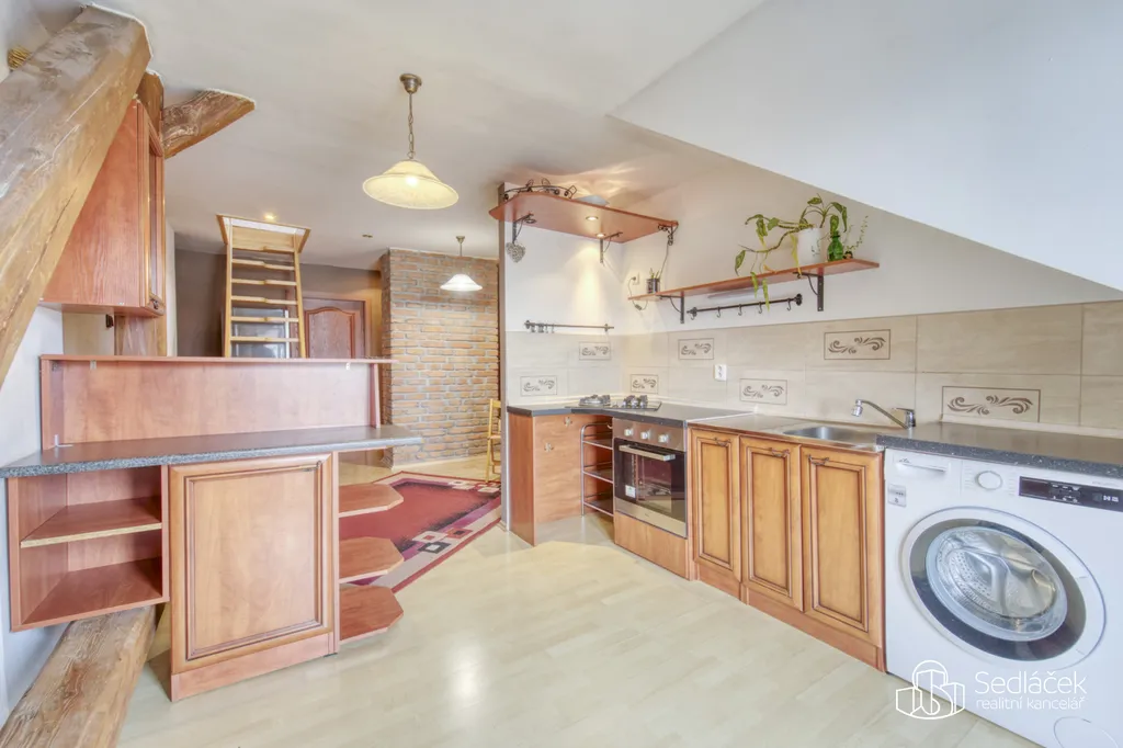Dispozice bytu nabízí kuchyň s jídelním koutem, dva neprůchozí pokoje a nadstavbový prostor přístupný po dřevěných schodech, vhodný jako dětský kout, herna či spaní. Interiér podtrhuje kombinace pohledových trámů, korkových podlah a střešních i klasických oken, díky nimž má byt jedinečný charakter. Prostorná koupelna disponuje vanou i sprchovým koutem. Vytápění je řešeno kondenzačním plynovým kotlem.