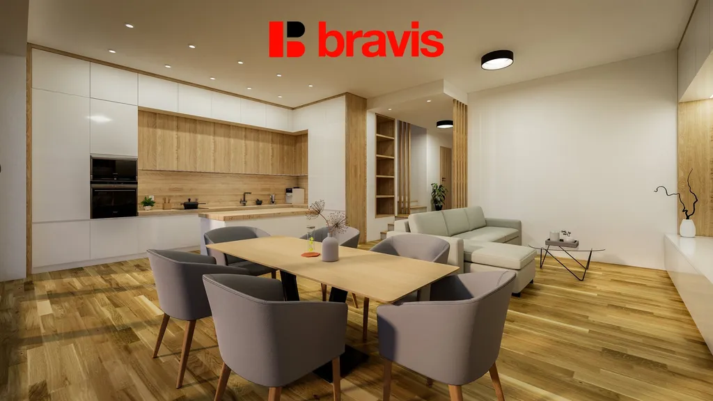 Srdcem domu je bezesporu velkorysý obývací pokoj s kuchyní o 44,2 m² se světlou výškou stropu 3.15m, odkud se přímo dostanete na terasu (22,7 m²).