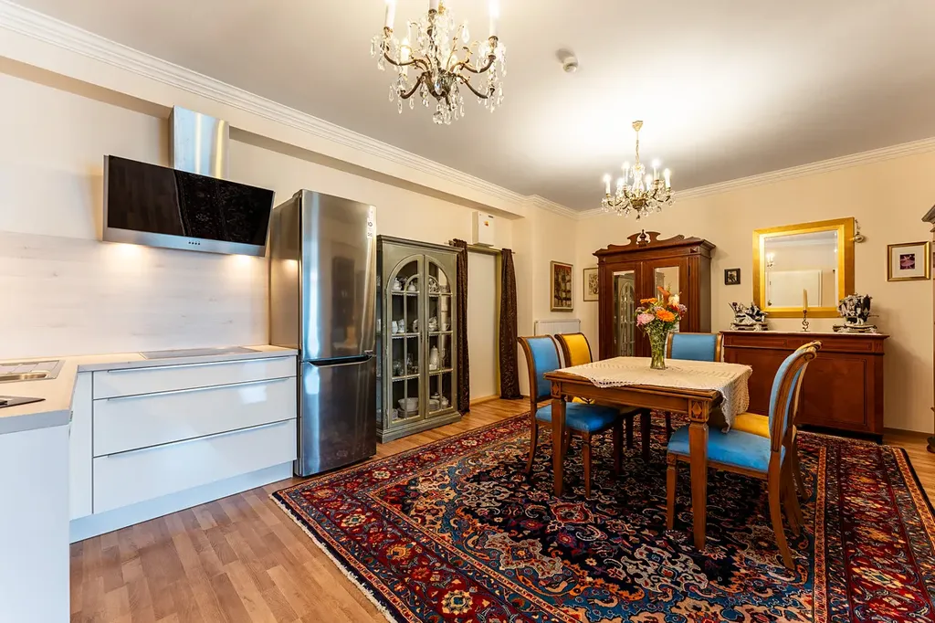 - Kvalitní vybavení, včetně kuchyňské linky s elektrospotřebiči a koupelny se zařizovacími předměty, pračkou a sušičkou.
