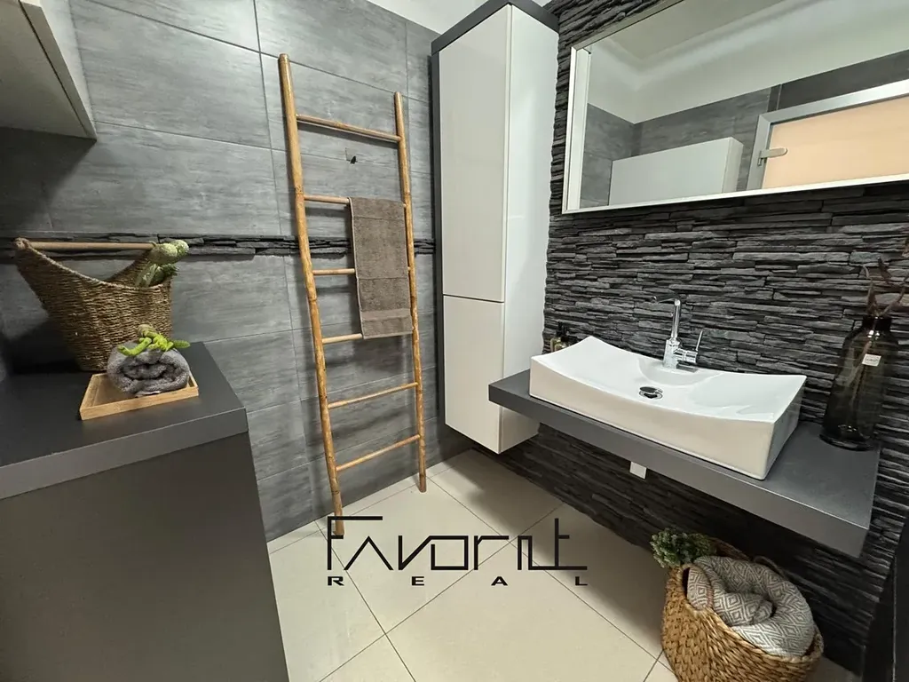 Koupelna je vybavena vanou, koupelnovým nábytkem a přívodem na pračku, toaleta je řešena samostatně. V celém bytě je položena velkoformátová dlažba, která podtrhuje moderní vzhled interiéru a zároveň je velmi praktická na údržbu.