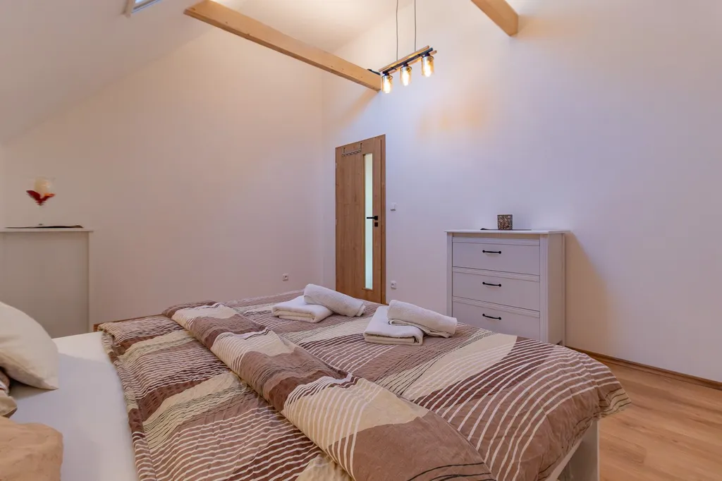 Apartmán č. 4. o podlahové ploše 47,8 m2 je kompletně moderně a vkusně vybavený jak elektrospotřebiči, tak nábytkem. Vnitřní dispozice 2+kk v 1. NP: vstupní předsíň, kuchyňský kout - kuchyňská linka zn. Oresi ( s el. horkovzdušnou troubou s indukční deskou, mikrovlnnou troubou, lednicí s mrazákem zn. Mora). Jídelní koutek s obývacím prostorem včetně nábytku a TV ; ložnice. Koupelna (se sprchovým koutem, umyvadlem, topným žebříkem a připojením k pračce, baterie – Grohe, sanita - Geberit), samostatné WC. V rámci rekonstrukce bylo provedeno zaizolování stropů, položeny protihlukové podlahy, plovoucí podlaha zn. Quick – Step a protihlukové stěny mezi apartmány, okna dřevěná s trojskly. Vytápění je řešeno klimatizací Haier - ovládanou tel., vjezdová brána ovládaná tel. a kódovým systémem, samostatné připojení wifi, kamerový systém. K bytu náleží vlastní venkovní prostor k posezení, kój (5m2), jedno parkovací stání u domu a společné venkovní prostory k odpočinku. Voda čerpána z vrtané studny, odpad řešen ČOV. V rezidenci je dále k dispozici využití sauny a fitness.