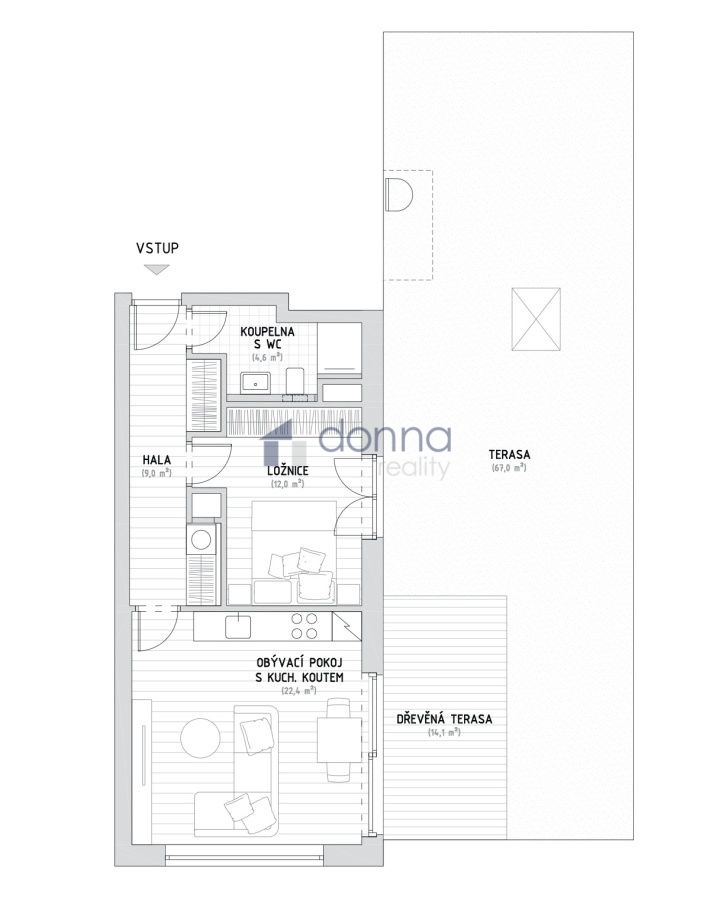 Nabízíme k prodeji moderní byt 2+kk o ploše 51,3 m2 + terasa 81m2, situovaný ve 3. patře bytového domu s výtahem v komplexu Bleriot z roku 2020, Prahy 9 - Kbely, ulice Plzákova.