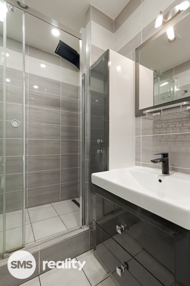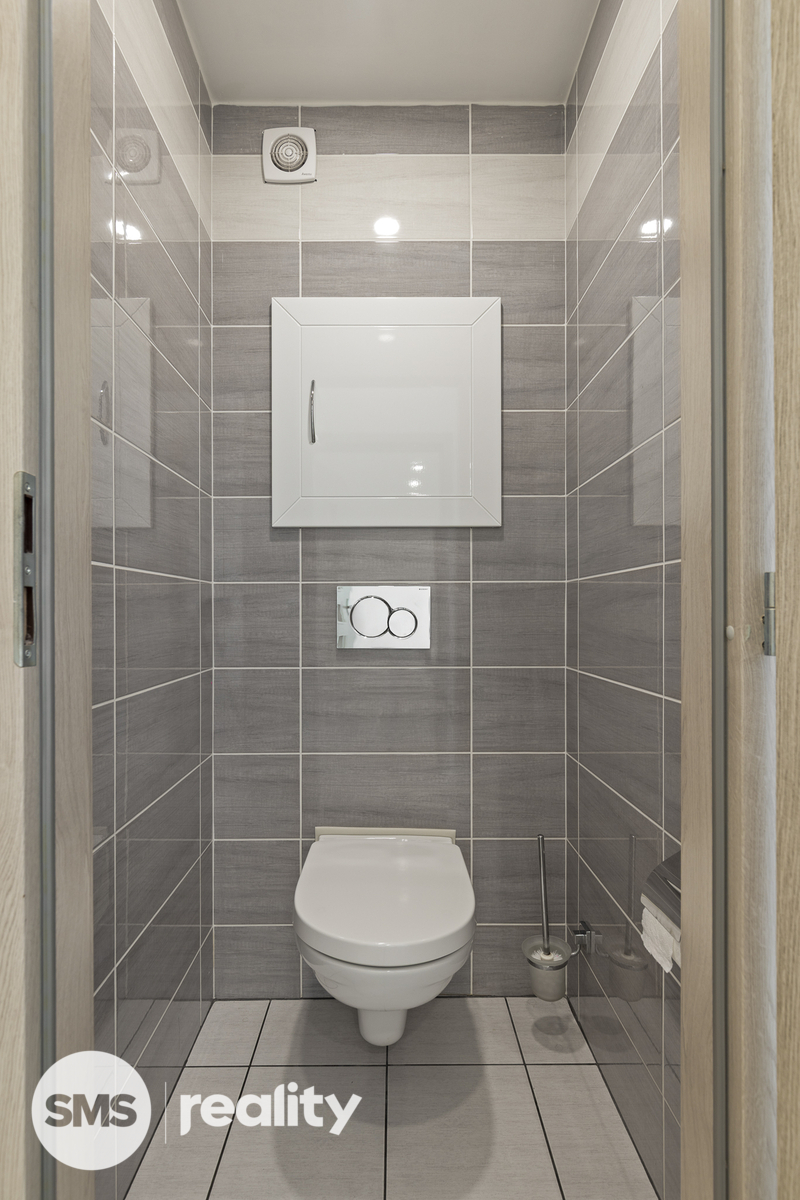 Koupelna i samostatné WC jsou řešeny moderně a prakticky. Součástí bytu je také sklep, který poskytuje další úložný prostor.