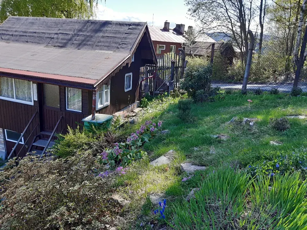 Na prodej pozemek se zahradní chatou, venkovním posezením a upravenými záhony v zahrádkářské kolonii osazené do jižního svahu v obci Desná část Desná I.