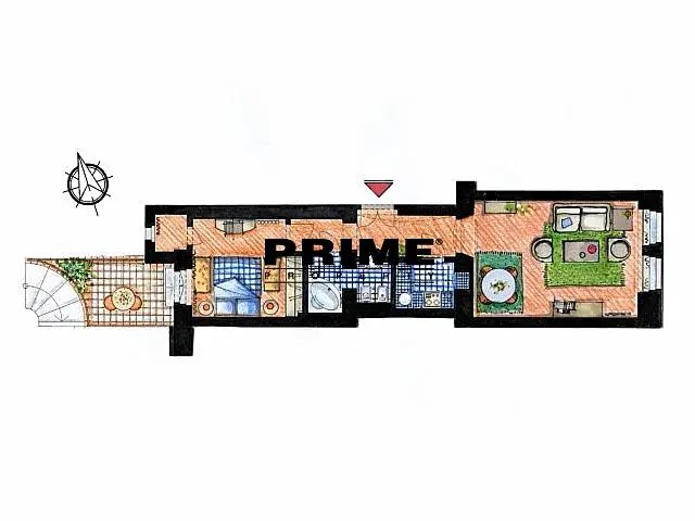 Dispozice bytu: vstupní předsíň, obývací pokoj s jídelní částí, plně vybavená, samostatná kuchyňka se spotřebiči (plynová varná deska, lednice, mrazák, myčka, mikrovlnná trouba a pračka), ložnice (orientovaná do klidného vnitrobloku) s vestavěnou skříní a komorou a vstupem na privátní terasu se zahrádkou (6m2) a koupelna (s vanou, umyvadlem, toaletou a bidetem).
