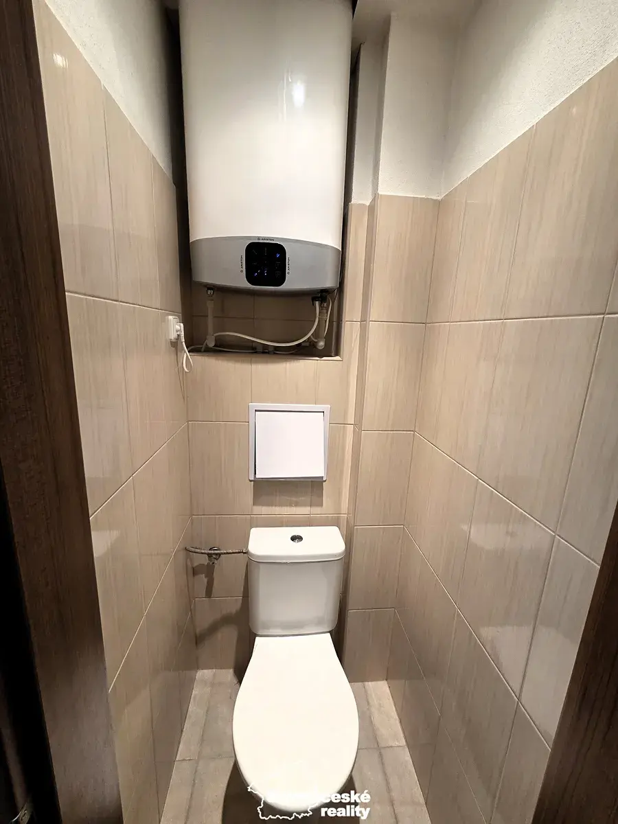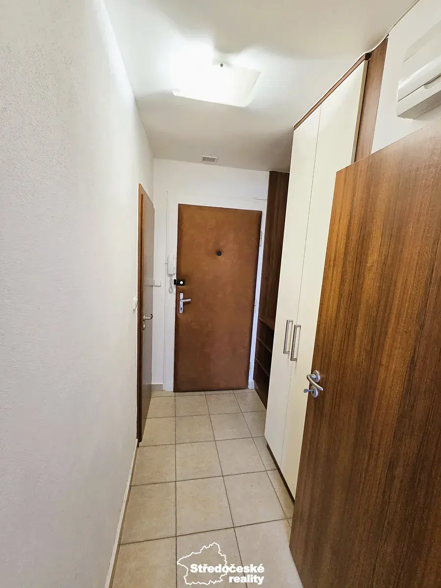 Byt sestává z chodby vybavené skříněmi na míru, wc je samostatné, obytná místnost o vel. cca 20 m2 je vybavena kuchyňskou linkou se sklokeramickou deskou, troubou, vestavěnou lednicí s mrazákem a zabudovanou pračkou. V koupelně je sprchový kout. Podlahy v bytě jsou plovoucí, okna plastová. V bytě dostupný Vodafone internet + O2.