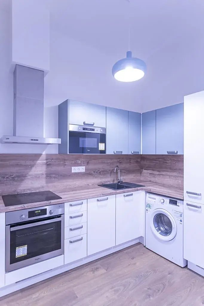 Dispozice a vybavení: Vkusně zařízený byt sestává ze vstupní chodby, odkud se dále vstupuje do světlého obývacího pokoje s kuchyňským koutem. Kuchyňský kout je od obýváku částečně oddělen, a je vybaven pěknou kuchyňskou linkou se všemi spotřebiči (lednice s mrazákem, myčka, varná deska, el. trouba, digestoř, mikrovlnná trouba). Je zde také pračka. Obývací část místnosti je zařízena rozkládací pohovkou a jídelním stolem s židlemi. Ložnice je vybavena postelí s nočními stolky a velkou šatní skříní. Do koupelny, která je zařízena umyvadlem, skříňkou, sprchovým koutem a toaletou, se vstupuje z chodby. K bytu dále náleží sklep o velikosti cca 5 m2.
