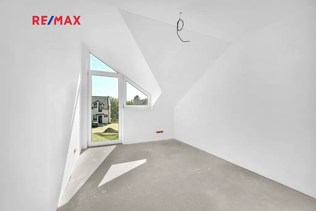 Podkroví ukrývá tři samostatné ložnice, koupelnu s vanou, samostatné WC a prostornou chodbu se vstupy do všech pokojů.