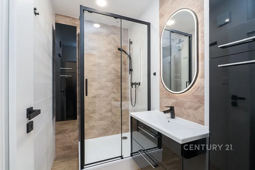 Součástí je nová kuchyňská linka, stylová koupelna se sprchovým koutem, kompletně nové podlahy, dveře, osvětlení a příjemné neutrální barvy v celém bytě. K bytu navíc patří sklep.