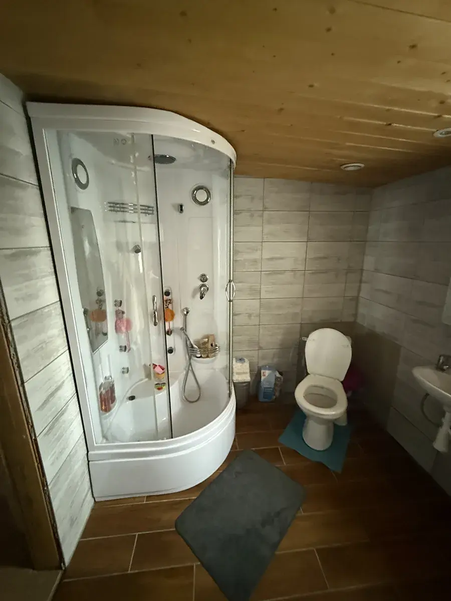 sporák. V koupelně se nachází sprchový kout, umyvadlo a klasická toaleta.