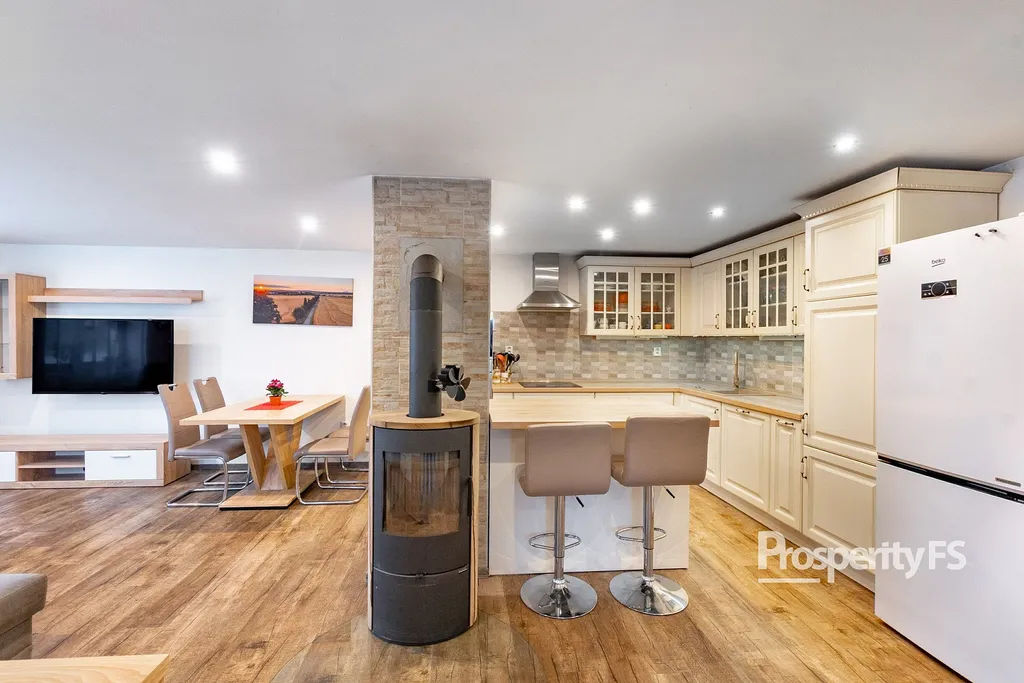 Přízemí domu je po rekonstrukci, plně obyvatelné a připravené k okamžitému užívání. Dispozice je praktická a dům působí velmi příjemným a udržovaným dojmem. Podkroví je připravené k rekonstrukci – k dispozici je zpracovaný projekt včetně platného stavebního povolení, což novému majiteli umožňuje plynule navázat na realizaci bez další administrativní zátěže.