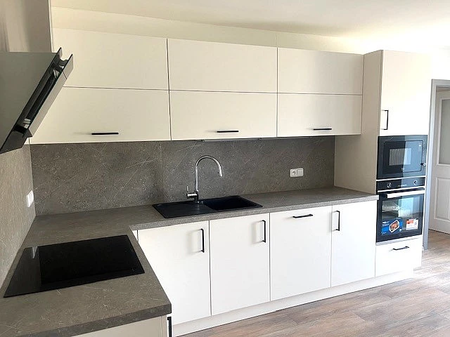 Podlahy jsou zde vinylové, a v koupelnách je dlažba.