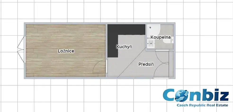 Byt má prostorný pokoj. Kuchyňská linka je umístěna v předsíni a je vybavená varnou deskou a lednicí. Koupelna má sprchový kout a toaletu. Byt je volný dle dohody.