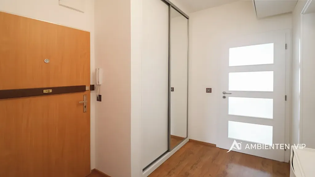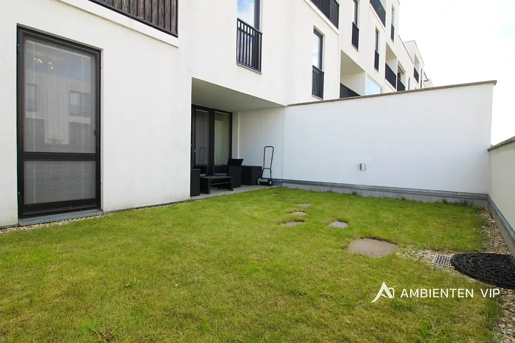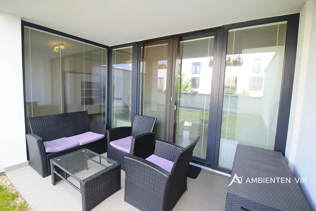 Byt se nachází v 1. NP moderního bytového domu s možností výborného parkování. Byt je částečně vybavený a uspokojí i náročného klienta. Nabízí úložné prostory v rámci vstupní chodby a pokoje, který je orientovaný do ulice. Ten je nyní využíván jako ložnice. Koupelna je vybavena umyvadlem, toaletou, vanou a pračkou. Dále se zde nachází otevřená dispozice kuchyně, jídelny a obývacího pokoje s přímým vstupem na terasu. Terasa má z části dlažbu a zbytek je travní plocha. Její orientace je na JZ. Kuchyňská linka je vybavena spotřebiči Siemens a to varnou deskou, digestoří, lednicí s mrazákem, troubou a mikrovlnnou troubou.