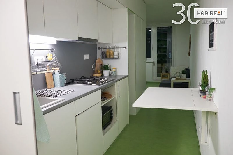 Je zde moderní koupelna se sprchovým koutem, kuchyňská linka s plynovým sporákem, přípravou na myčku, elektrickou troubu a mikrovlnku. Naproti lince je chytře vyřešen sklápěcí jídelní stolek, který je připevněný ke zdi a je možné jej jednoduše sklopit. Netradičně jsou řešeny i úložné prostory – sestava skříněk a polic, která prostorově odděluje kuchyňskou a obytnou část bytu. Pokud by toto řešení nevyhovovalo, tak ji lze jednoduše demontovat. Podlahy jsou z PVC, pod stropem jsou sádrokartonové podhledy.
