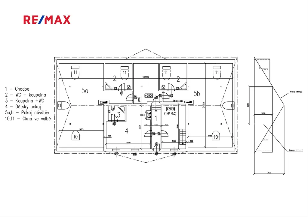 • 4 toalety, 3 koupelny s možností rozšíření o další koupelnu a toaletu v mezipatře.