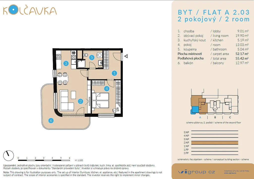 Zajímavě dispozičně řešený rohový byt 2+kk s balkonem se nachází ve 2NP domu a má jižní a západní orientaci. Obývací pokoj s kuchyňským koutem tvoří jeden celek a je z něj i přístup na prostorný balkon. Druhý pokoj nebo ložnice je pak orientována na západ. Součástí bytu je dále větší vstupní chodba s praktickým místem na případnou vestavěnou skříň a vstup do koupelna s WC a sprchový kout.