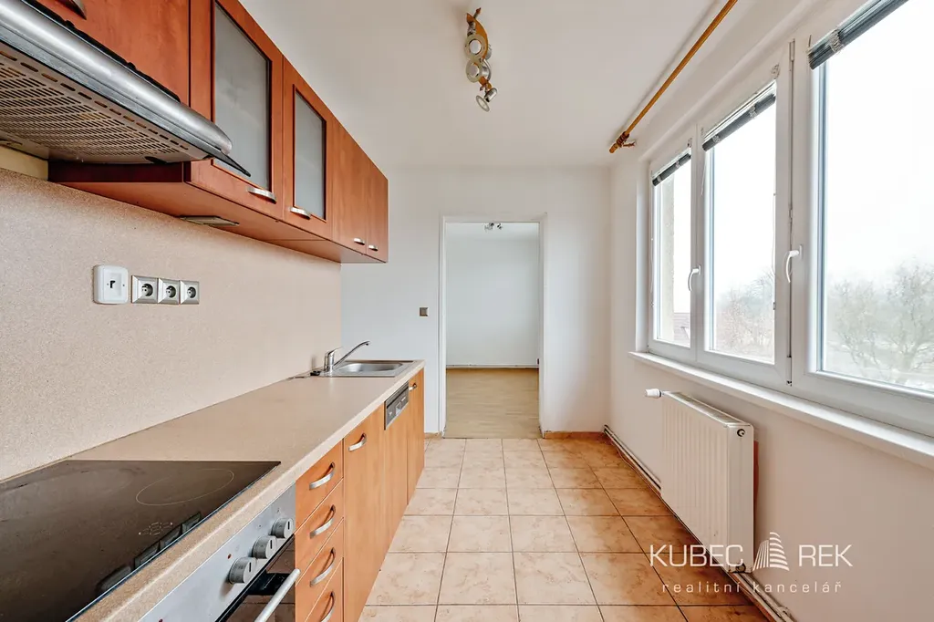 Interiér bytu je dobře dispozičně řešený, jednotlivé místnosti jsou prostorné a nabízí dostatek denního světla. Kuchyně je vybavena horkovzdušnou troubou, sporákem, digestoří, myčkou nádobí a dřezem. Kuchyňský prostor nabízí také dostatek místa pro jídelní stůl.