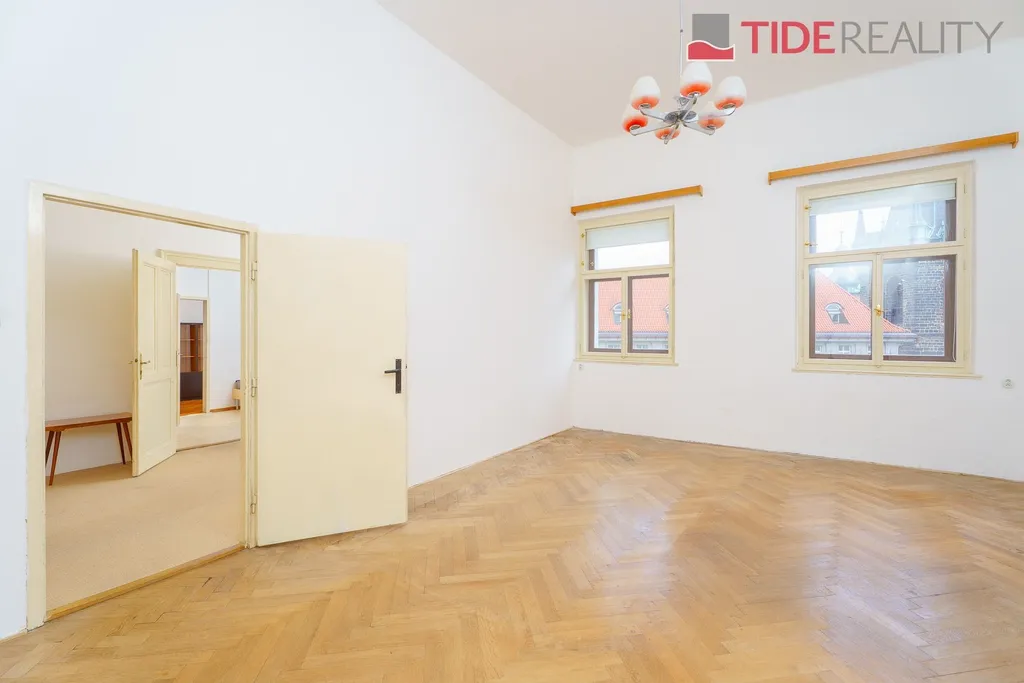 Jedinečná investiční příležitost! V exkluzivním zastoupení majitele nabízíme ke koupi velmi prostorný, světlý a hlavně klidný byt, který se nachází v naprostém centru Prahy 1, v 6. nadzemním podlaží, tj. v posledním obývaném patře (není půdní!) nádherně zrekonstruovaného secesního domu na Senovážném náměstí, přímo naproti Jindřišské věži. Tento byt s úžasným potenciálem se rozkládá na celkové ploše 91 m2 a nabízí velkou variabilitu budoucího stavu. Dělící mezipokojové zdi nejsou nosné, některé ani vyzdívané, rozložení pokojů a nová dispozice může být změněna dle individuálních požadavků nového vlastníka. Všechny 4 místnosti (15m2, 15m2, 20m2, 28m2) mají výšku stropu cca 4m (možné vestavět galerii), slunnou jižní orientaci a všechny nabízí jedinečný a ničím nezastíněný výhled na Jindřišskou věž. V bytě je vytápění zajišťováno tepelným čerpadlem vzduchvzduch se 4mi splitovými jednotkami v každé obytné místnosti, ohřev TV prostřednictvím karmy, plyn přiveden i do kuch.linky. Původní parketové podlahy ve všech místnostech, dř. špaletová okna.