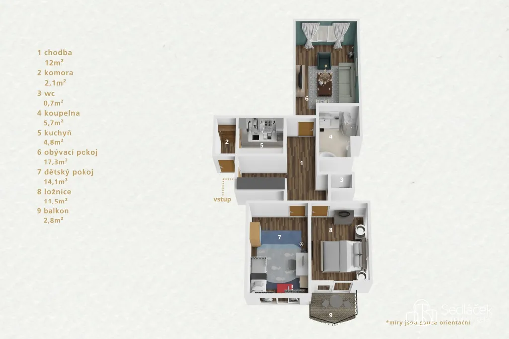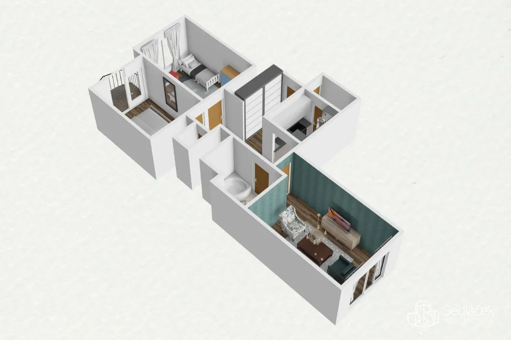 Dispozice bytu je detailně znázorněna v půdorysu, který naleznete v sekci fotografií.