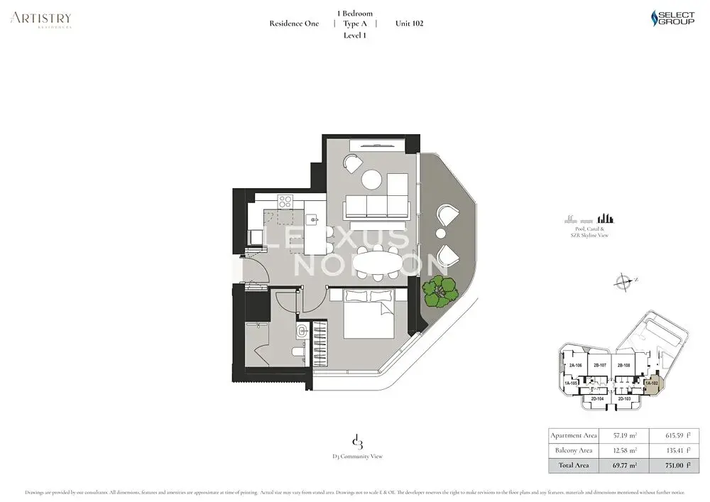 Nabízený byt 1+kk nacházející se v 1. nadzemním podlaží prémiového rezidenčního projektu Artistry One Residences v Dubai Design District. Byt nabízí užitnou plochu 70 m², K nezanedbatelným výhodám patří prostorný balkon o rozloze 13 m², který přirozeně rozšiřuje obytný prostor. Dispozice je velmi efektivní – oddělená ložnice, koupelna, úložné prostory a otevřený obývací prostor s kuchyní a jídelní částí. Díky rohovému řešení a velkoformátovým proskleným plochám působí byt vzdušně a nabízí příjemné výhledy na komunitu, bazén, Dubai Canal a panorama města.