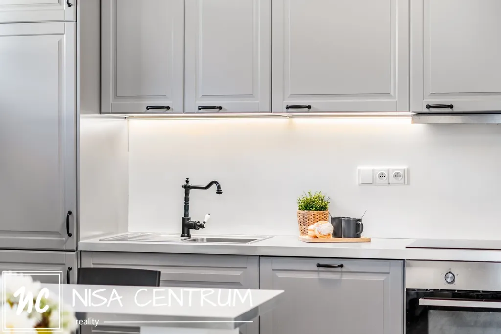 Kuchyňská linka je kompletně vybavena spotřebiči (sklokeramickou varnou deskou, myčkou, lednicí a mikrovlnkou). V koupelně je dostatek místa pro pračku. Bytová jednotka se prodává kompletně zařízená.