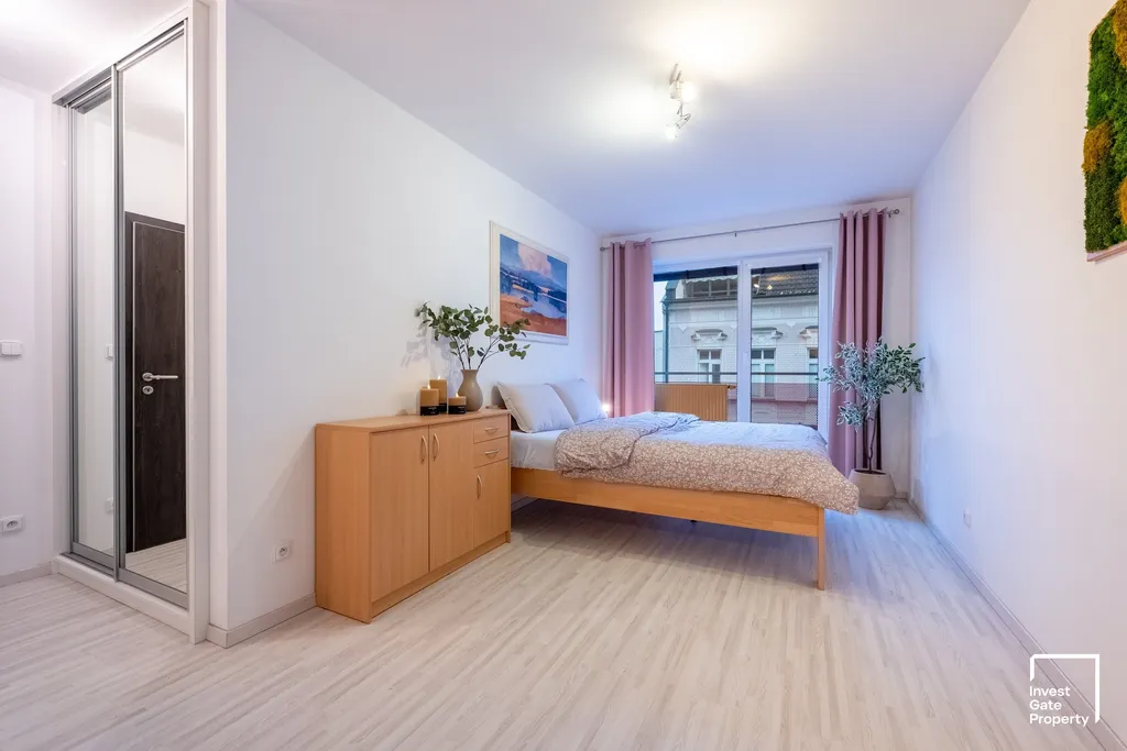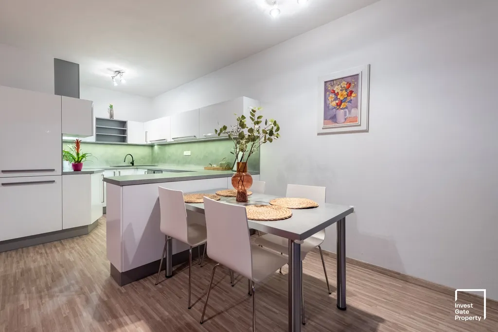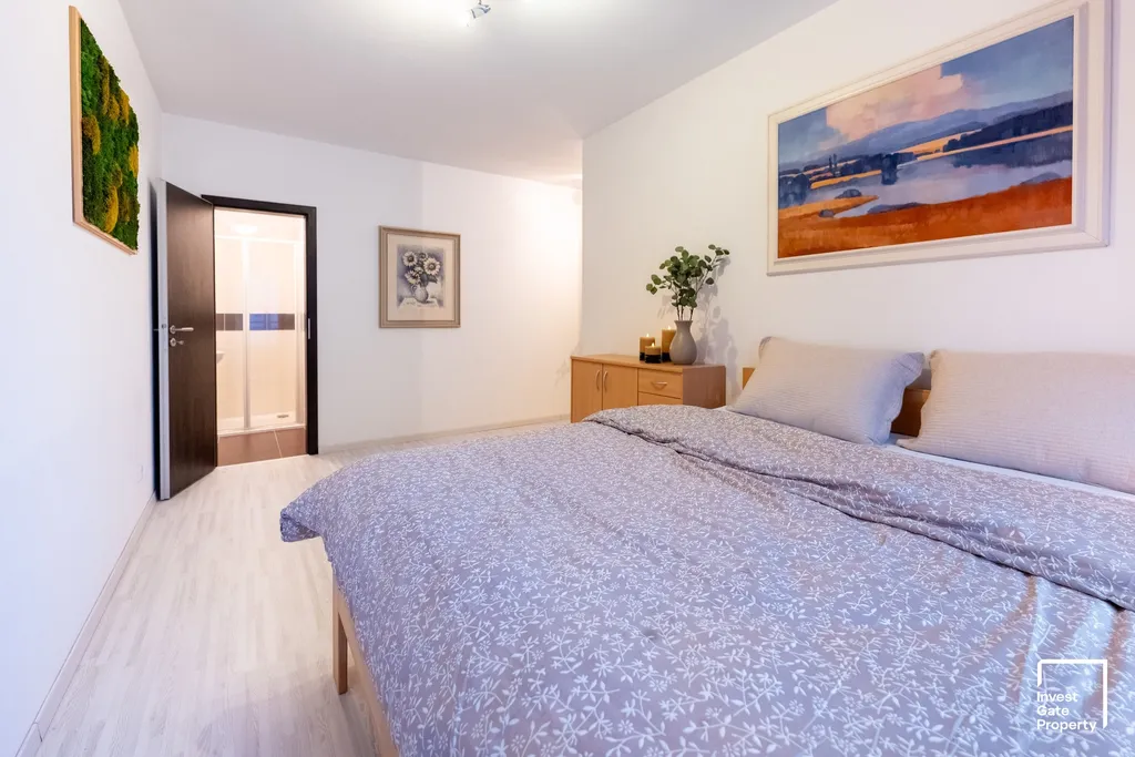 Promyšlená dispozice bytu komfort bydlení ještě zvyšuje – mezi obývacím pokojem s kuchyní a ložnicemi je chodba s koupelnou a WC, nebudete tak při spánku rušeni případným ruchem z obýváku. K bytu je možné dokoupit kryté parkovací místo.