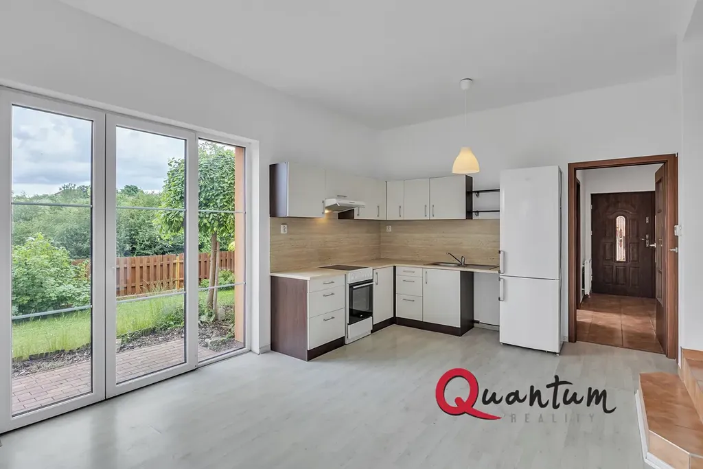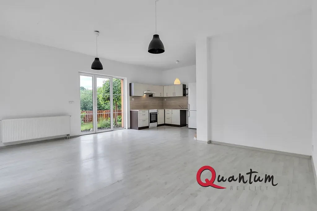 prostorný a prosvětlený obývací pokoj propojený s moderním kuchyňským koutem a přímým vstupem na soukromou zahradu (35 m²), která poskytuje příjemné místo pro relaxaci i rodinné chvíle