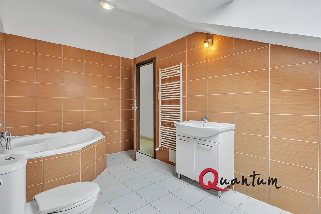 elegantní koupelna s rohovou vanou a toaletou (7,9 m²)