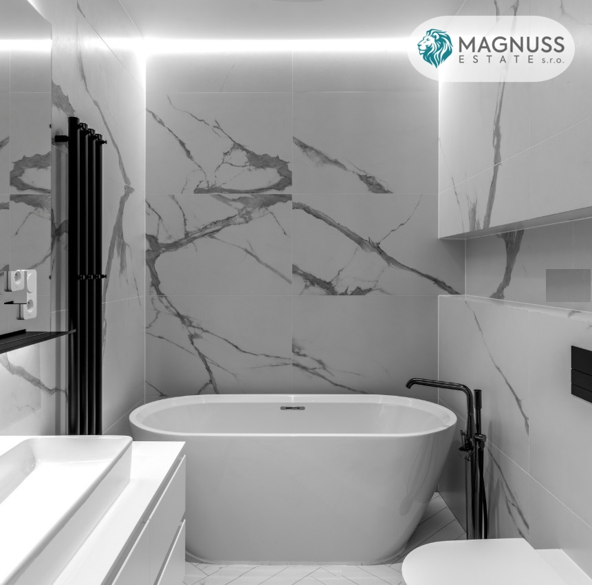 Moderní koupelnu s vybavením Laufen, velkoformátovou dlažbou, vanou, sprchovým koutem a dvěma umyvadly