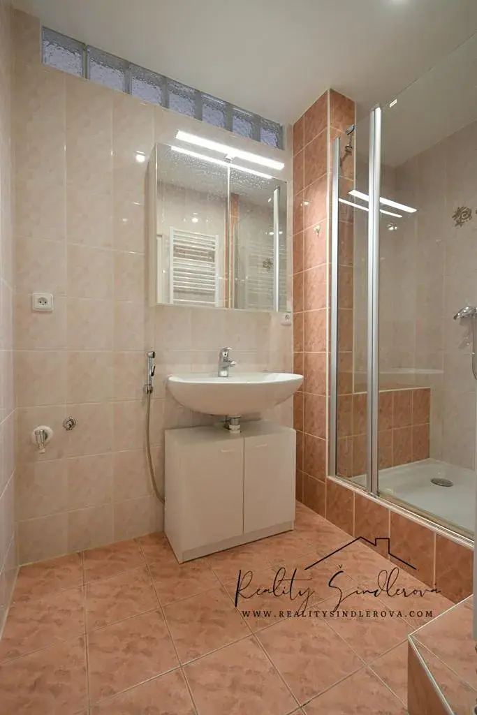- Součástí vybavení je starší umývadlová skříň a zrcadlová skříň s osvětlením.