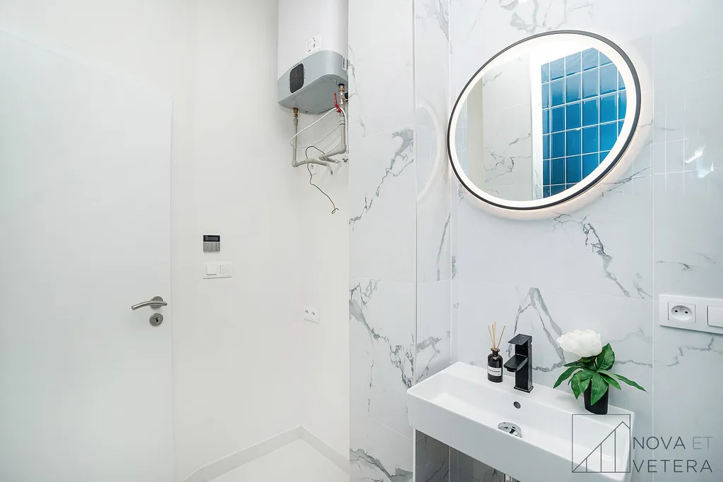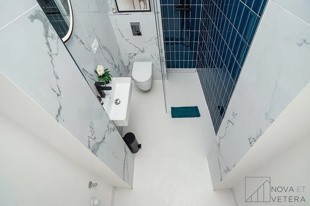 Vytápění zajišťuje moderní elektrické podlahové topení s uhlíkovými fóliemi a Wi-Fi termostaty, které umožňují dálkové ovládání teploty přes mobilní telefon.