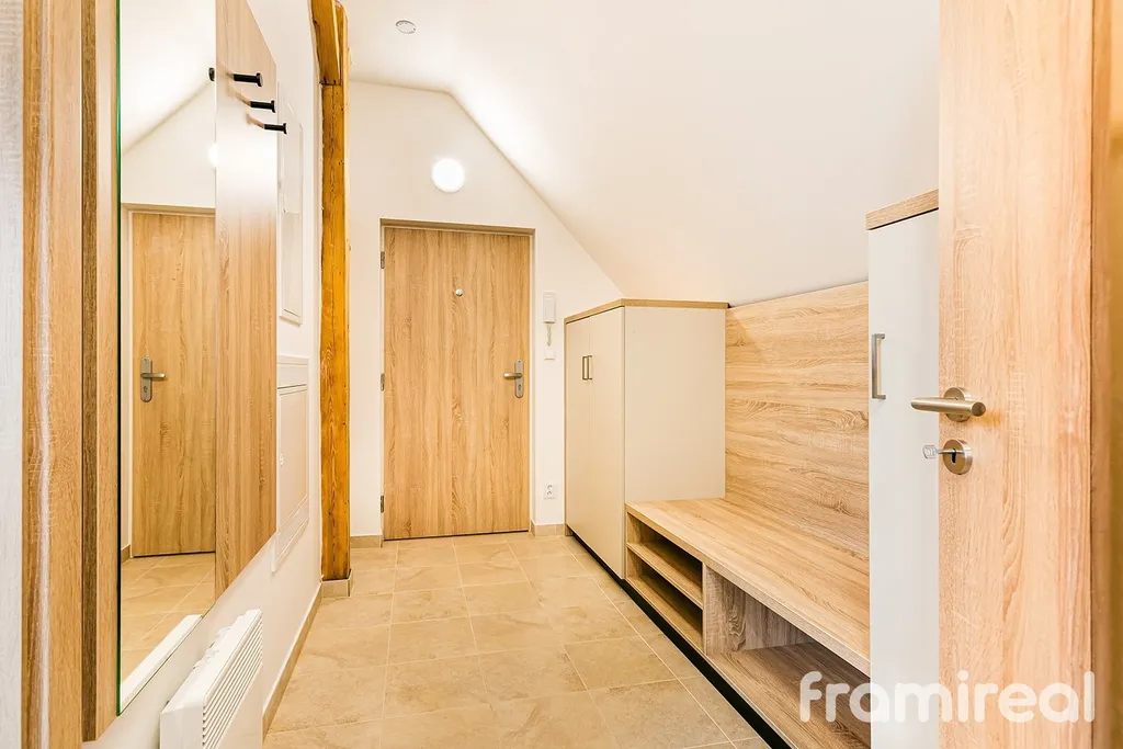 Byt byl navržen s důrazem na pohodlí a praktické využití prostoru. Kuchyňská linka je vybavena kvalitními spotřebiči, v předsíni najdete vestavný nábytek, který poskytuje dostatek úložného prostoru.