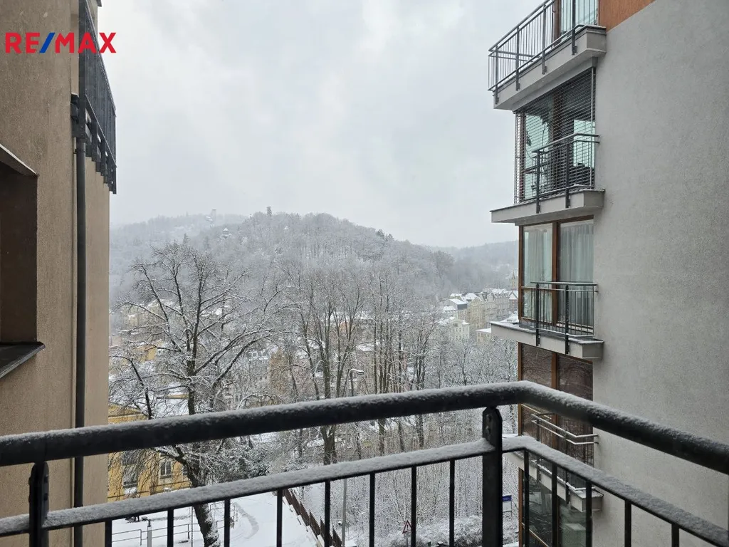 Dominantou bytu je prostorný obývací pokoj s kuchyňským koutem a výhledem na Karlovy Vary, který interiéru dodává světlo, otevřenost a příjemnou atmosféru.