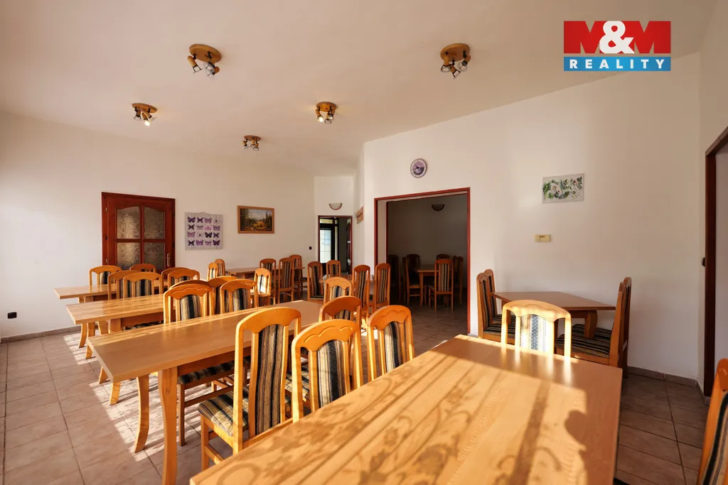 1. nadzemní podlaží – komerční část (12 místností): větší sál s kapacitou 25–35 osob, bar a kompletně vybavená nerezová kuchyně, ideální pro hospůdku, svatby či oslavy a přímý vstup na dvorek. Druhý sál pro 35–40 osob s menším barem, dále několik úložných prostor, sociální zázemí (WC, sprcha, umyvadla).