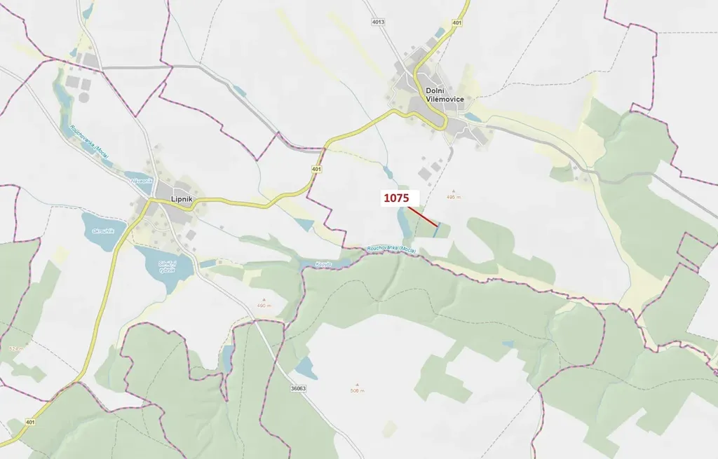 Lesní pozemek o výměře 1134 m2, parcelní číslo 1075, podíl 1/1, katastrální území Dolní Vilémovice, obec Dolní Vilémovice, obec s rozšířenou působností Třebíč, okres Třebíč, Kraj Vysočina. Po těžbě.