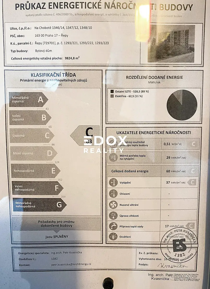Průkaz energetické náročnosti budovy byl předložen, proto dle zákona uvádím hodnotu C. Nejedná se o návrh na uzavření smlouvy (nabídku) ve smyslu § 1731 a §1732 zákona č. 89/2012 Sb., Občanského zákoníku. Společnost Edox reality s.r.o. si vyhrazuje právo uzavření všech smluvních vztahů písemně. Uvedené informace mají pouze informativní charakter a mohou se v průběhu inzerce změnit.