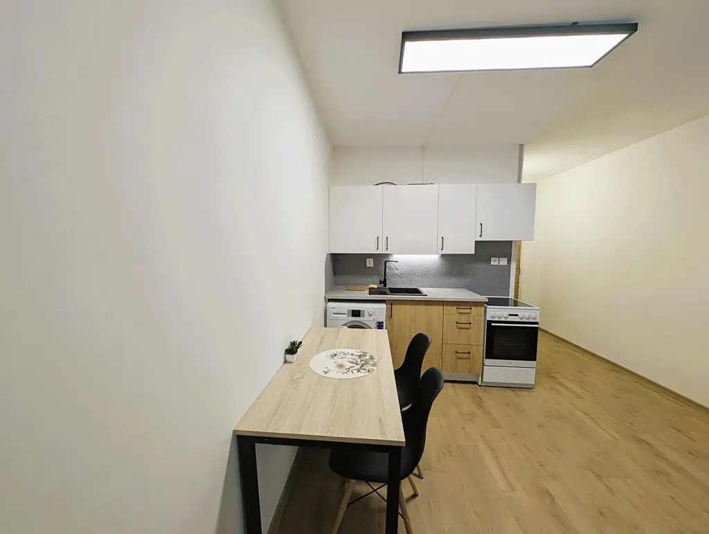 Kuchyňská linka je vybavena sporákem s troubou. Součástí vybavení je také skříň, televize, stůl se dvěma židlemi, pračka a lednice stačí se jen nastěhovat.