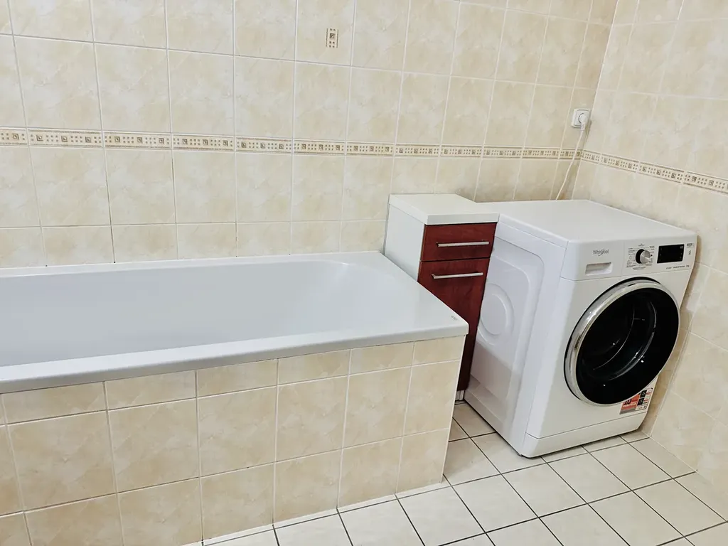 Koupelna: umyvadlová skříňka, zrcadlo, vana, topný žebřík, osvětlení, pračka.