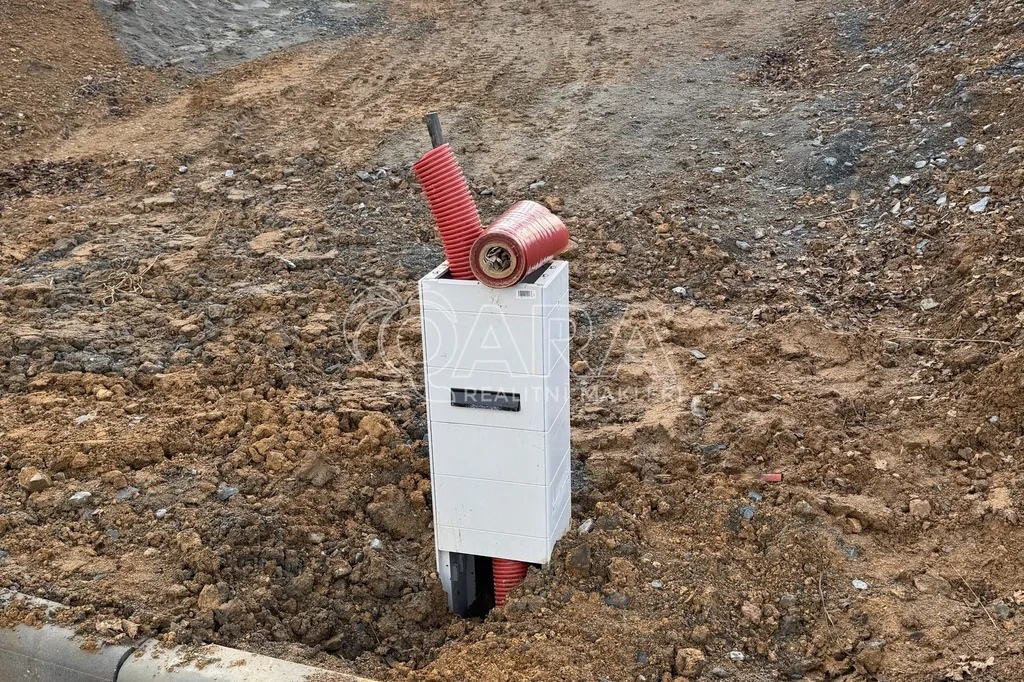Na pozemku je z velké části již hotová infrastruktura. Je provedeno napojení na splaškovou a srážkovou kanalizaci, přivedena elektřina a hrubé úpravy terénu. Dále je hotový suchovod, který se napojí hned jak bude provedena úprava vodojemu v obci. Rovněž je vydáno stavební povolení na realizaci vrtané studny až do 50 m hloubky. Majitel pozemku tak bude mít v budoucnu možnost napojení na obecní vodovod i na studnu. Co se týče studny, tak každý pozemek bude mít vlastní vrt, jehož instalace je v ceně.