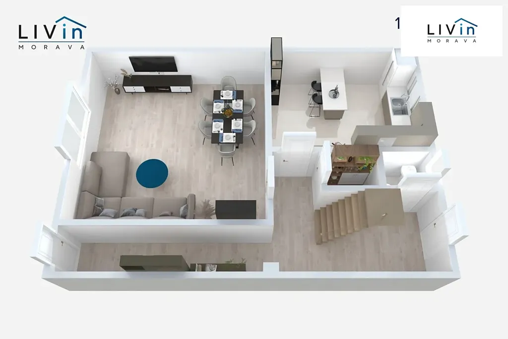V 1. nadzemním podlaží se nachází vstupní chodba, kuchyň o ploše 12,3 m², obývací pokoj o velikosti 23,5 m², samostatné WC (1,2 m²) a spižírna (1,3 m²). Spižírnu je možné stavebně upravit na menší koupelnu se sprchovým koutem, přičemž výhodou je bezprostřední blízkost WC, a tím i snadné napojení na stávající rozvody odpadů.