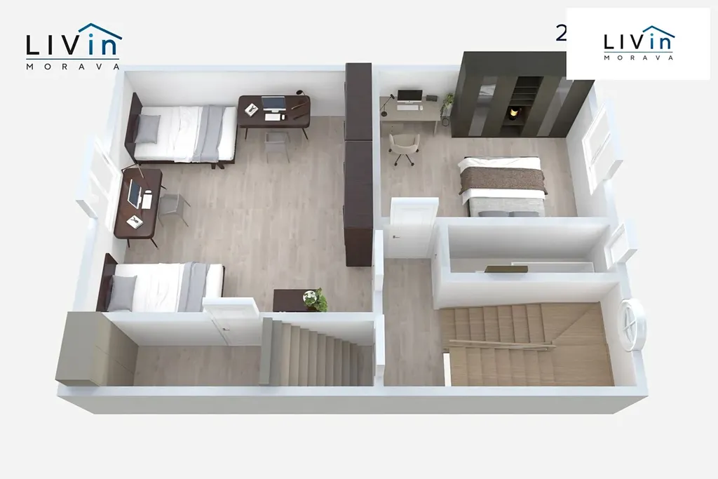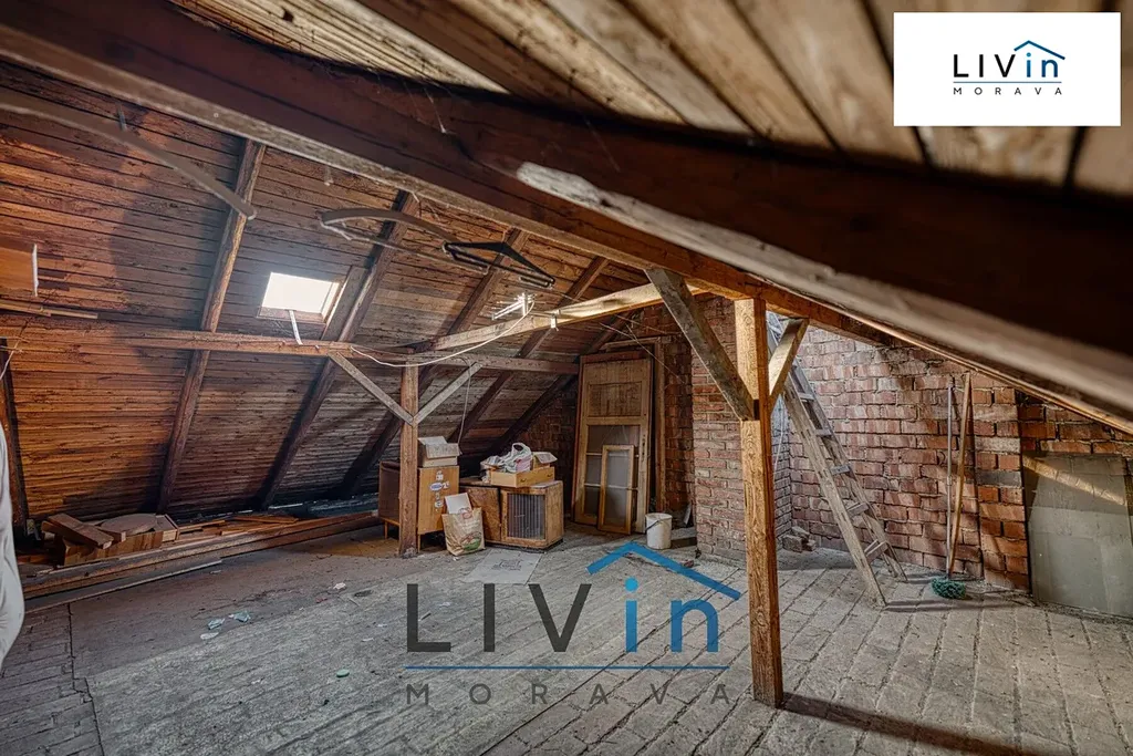 Po bytelném schodišti se dostanete do 2. nadzemního podlaží, kde se nachází dva neprůchozí pokoje (12,3 m² a 23,5 m²), šatna (4 m²), koupelna (2,65 m²), chodba (4 m²) a schodiště (5,5 m²), které dále vede na půdu. Půda o rozměru cca 8,5 × 6 metrů nabízí potenciál pro rozšíření obytné plochy domu formou půdní vestavby.