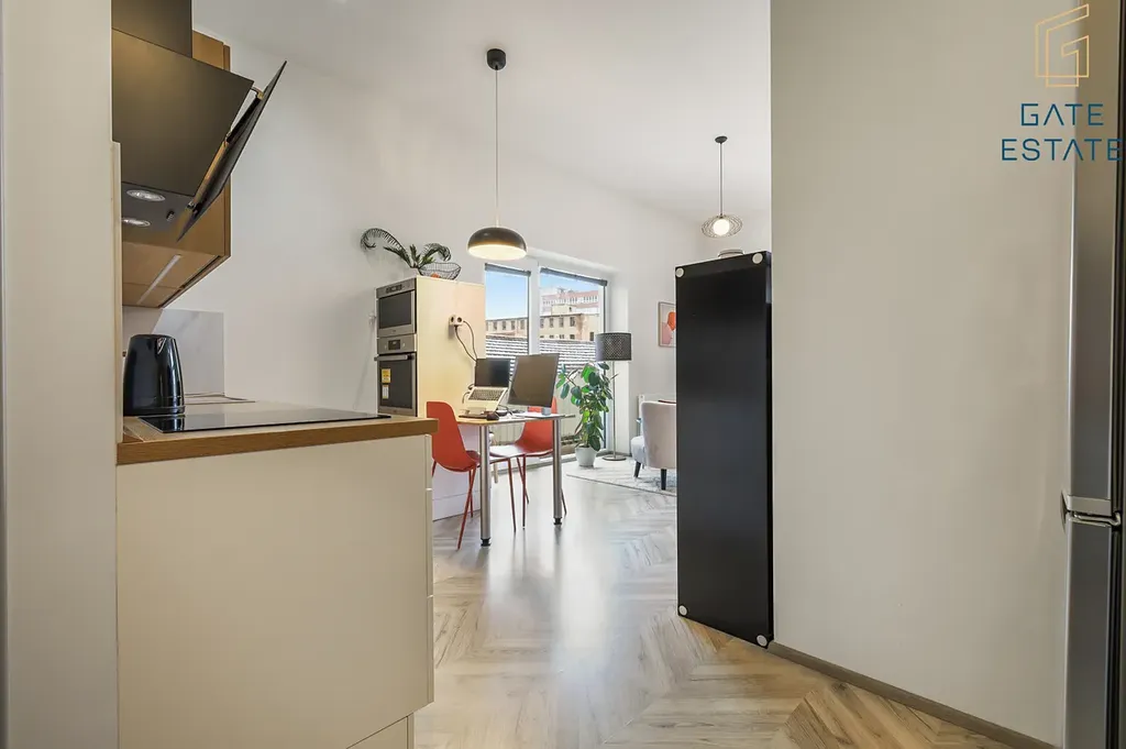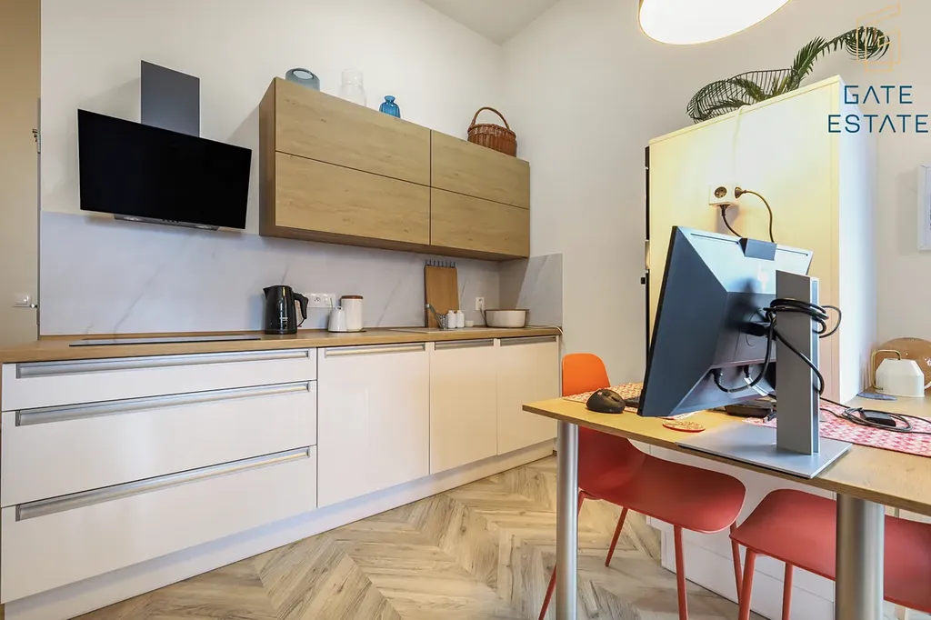 Dominantou bytu je moderní kuchyňská linka, která nabízí dostatek úložného i pracovního prostoru. Kuchyň je vybavena indukční varnou deskou, elektrickou troubou, mikrovlnnou troubou, myčkou a navazuje na jídelní kout s jídelním stolem. Součástí bytu je také lednice a pračka, které zůstávají k dispozici. Z dalšího vybavení na bytě zůstává šatní skříň.