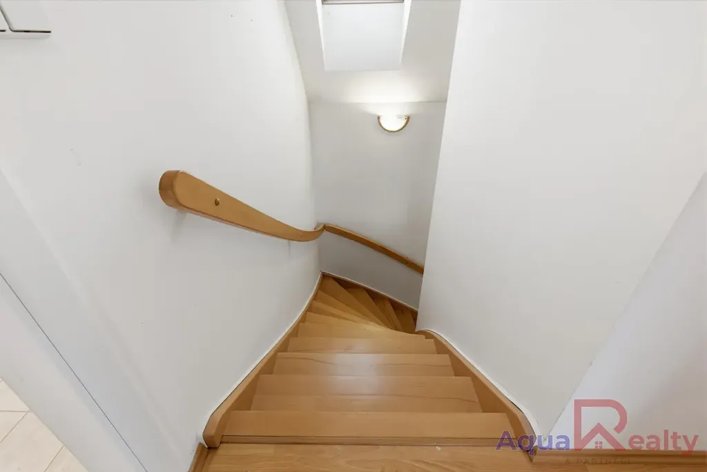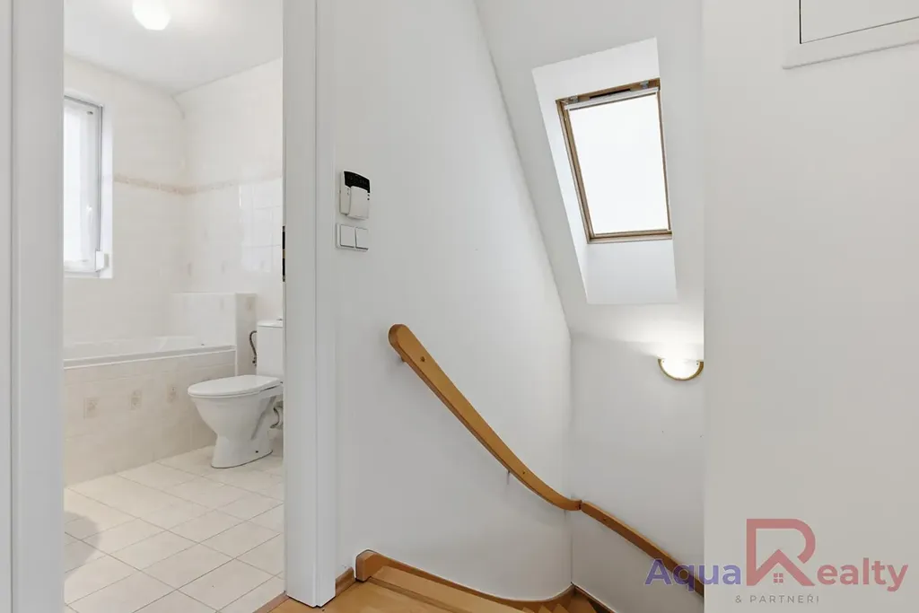 V patře jsou situovány dvě prostorné ložnice, které mají přístup na společný balkon orientovaný na jižní stranu, díky čemuž jsou pokoje světlé a prosvětlené po celý den. Jedna z ložnic má téměř 30 m a nabízí možnost rozdělení na dva samostatné pokoje, čímž lze obnovit původní projektovou dispozici 5+kk. Patro doplňuje koupelna s vanou a menší šatna.
