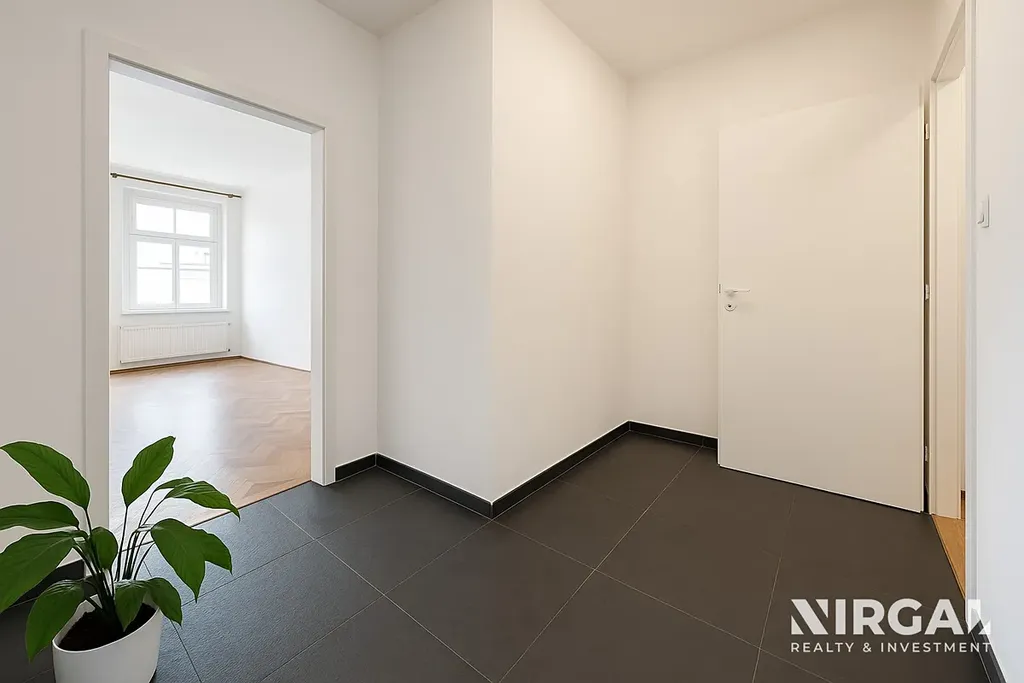 Interiér velmi prostorného obývacího pokoje, laděný ve světlých tónech, působí elegantně a vzdušně a nabízí harmonický prostor s dostatkem denního světla. Otevřená kuchyň je propojena s obývacím pokojem a ložnicí orientovanou do klidné ulice, což zajišťuje maximální soukromí. Oba pokoje jsou vybaveny elegantní parketovou podlahou, která interiéru dodává noblesní charakter. Byt je částečně vybavený – součástí je nová kuchyňská linka se spotřebiči (trouba, digestoř, varná deska, myčka, lednice). V koupelně se nachází sprchový kout, toaleta, podlahové vytápění a moderní žebříkový radiátor. Součástí vybavení je také pračka.