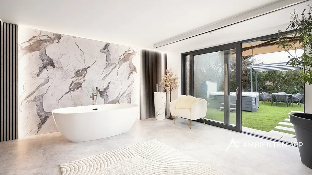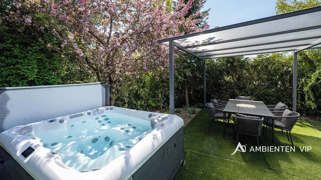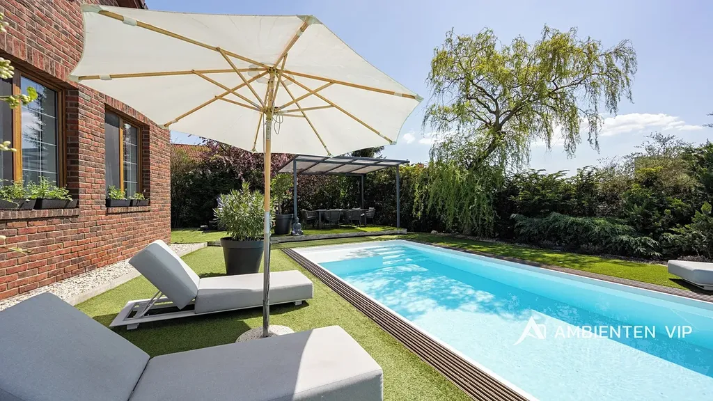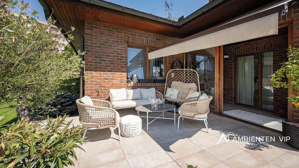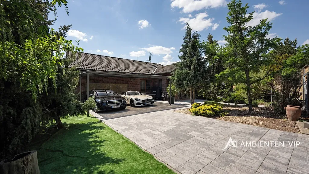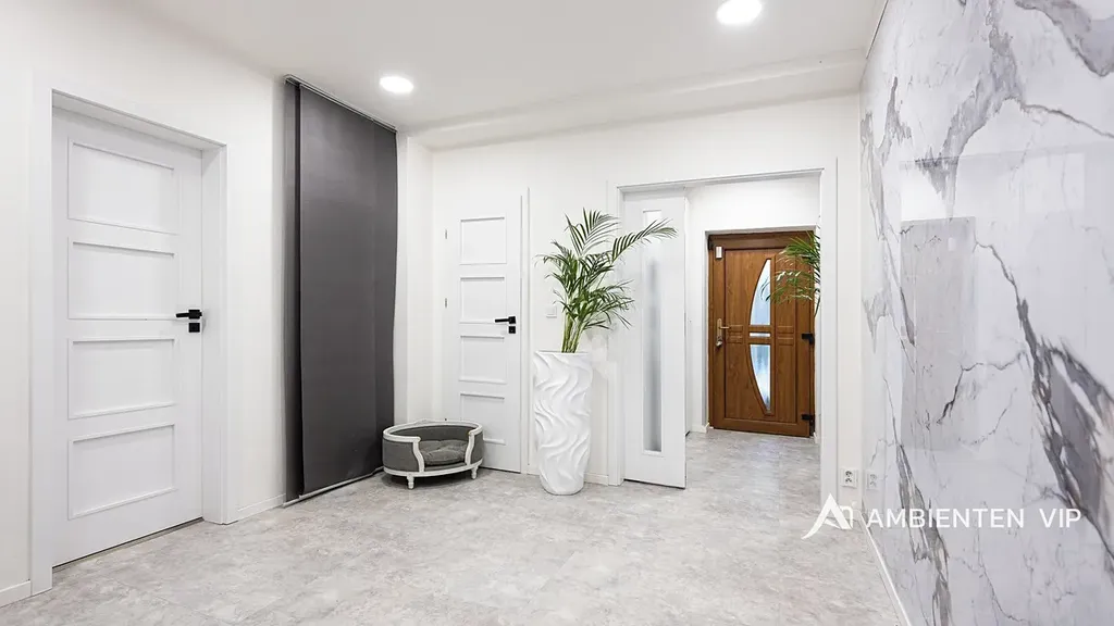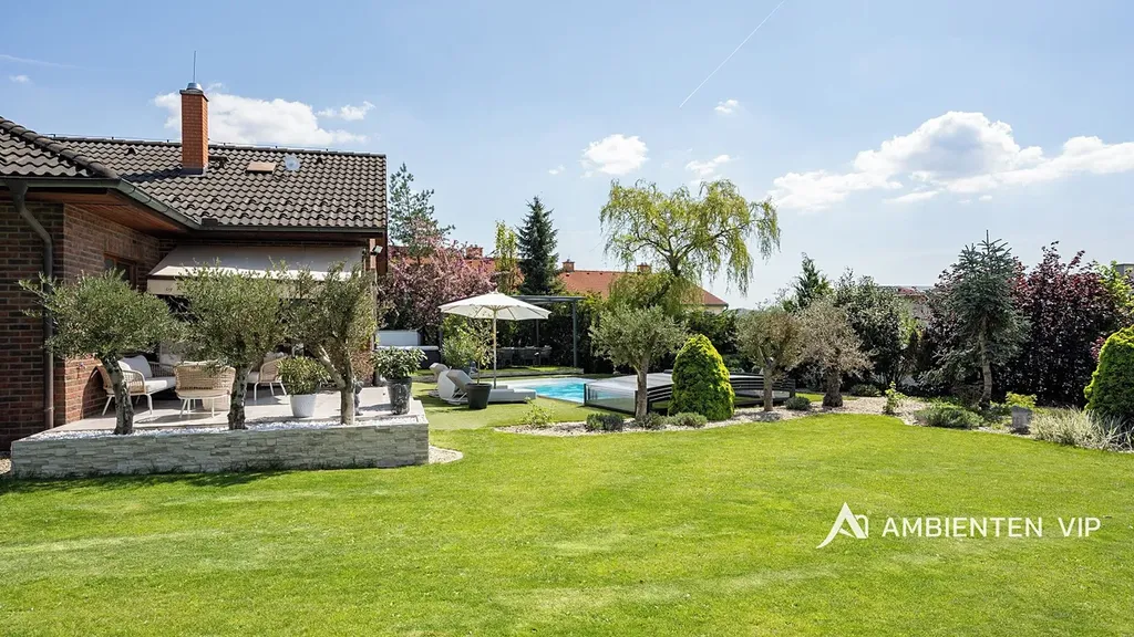 Tato vkusně a moderně zařízená vilka po rekonstrukci vás okouzlí nejen interiérem, ale i prostornou zahradou skýtající různé formy využití. Vstup do domu je přes prosklené zádveří, ze kterého vstoupíte do vzdušné světlé předsíně, která je obložená moderními panely s mramorovou texturou s velkorysým úložným prostorem a vstupem do téměř všech místností domu. Po levé straně naleznete průchod do prostorné šatny s ostrůvkem, přes kterou se prochází do luxusní ložnice. Ta má přímý výstup k bazénu a vířivce. Dominantou ložnice je na zakázku vyrobené dvojlůžko, samostatně stojící vana, umyvadlo a projektor s plátnem. Přímo z postele ložnice máte nádherný pohled do okrasné zahrady. Plátno projektoru lze využít i jako roletu. Otevřená dispozice obývacího pokoje, kuchyně a jídelny je příjemným prostor pro vaši rodinu. Kuchyňská linka je od firmy Mikyska. V rámci obývacího pokoje můžete spočinout na značkové sedačce, využít jídelní stůl s designovými židlemi či připravit pro rodinu výborné menu za pomoci moderních spotřebičů, většinou značky Miele. Za zmínku stojí varná část kuchyně nabízející Combi set pro pánev Wok a přípravu čerstvých paniny. Při přípravě pokrmů, stejně jako při relaxaci na sedačce můžete pozorovat život na zahradě, která obklopuje celý dům. Z obývací části je vstup na prostornou terasu až ke krytému bazénu se slanou vodou a protiproudem. Odpočinkovou zónu vkusně doplňuje vzrostlá středomořská vegetace v elegantních květináčích. Pokud se vydáte z předsíně vpravo, zavítáte do jednoho z dětských pokojů. V budoucnosti lze i tento pokoj propojit s terasou a přímým vstupem na zahradu. Vedle dětského pokoje se nachází technická místnost s pračkou a sušičkou a dále vstup do koupelny s toaletou a sprchovým koutem a dvěma umyvadly. Vytápění domu je přes plynový kotel Baxi. V přízemí domu je podlahové vytápění. Ve druhém patře domu se nachází dětský pokoj, který majitelka vkusně vyzdobila dětskou tapetou a vytvořila pohádkové království pro vaše děti. Celá zahrada je oplocená dřevěným plotem. Nabídne vám prostor, jak pro váš odpočinek, tak lze i část zahrady využít jako druhé stavební místo. Na pozemku máte soukromí, jelikož je zeleň v zahradě poměrně vzrostlá. Na zahradě se nachází domek na nářadí a herní plocha pro děti. Zdivo domu je cihla s obkladem Klinker. Okna jsou plastová s izolačním dvojsklem. Rodinný dům prošel nákladnou rekonstrukcí, která se uskutečnila v roce 2021 a 2024.