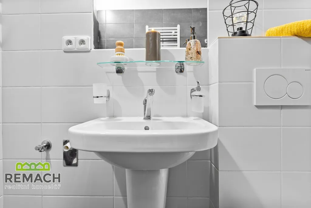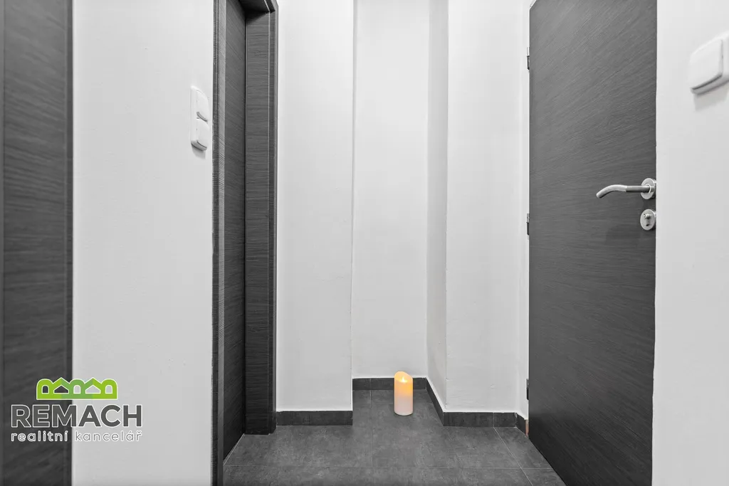 Vstupní chodbička vás přivítá a dává přístup k rekonstruované koupelně se sprchovým koutem a přípojkou na pračku.